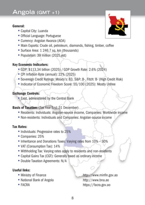 ▪ Residents: Individuals: Angolan-source income, Companies: Worldwide income