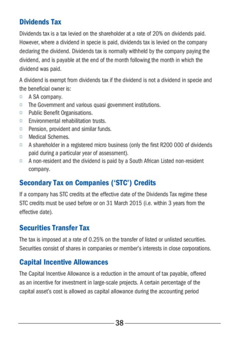 Dividends tax is a tax levied on the shareholder at a rate of 20% on dividends paid.