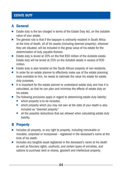 n Estate duty is levied at 20% on the first R30 million of the dutiable estate.