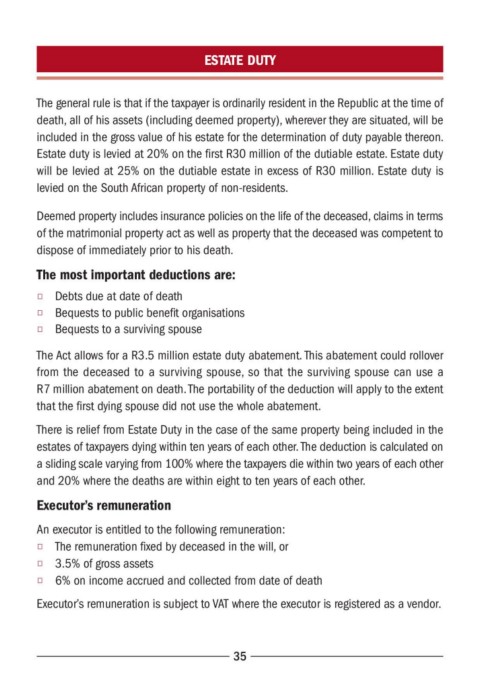 will be levied at 25% on the dutiable estate in excess of R30 million. Estate duty is